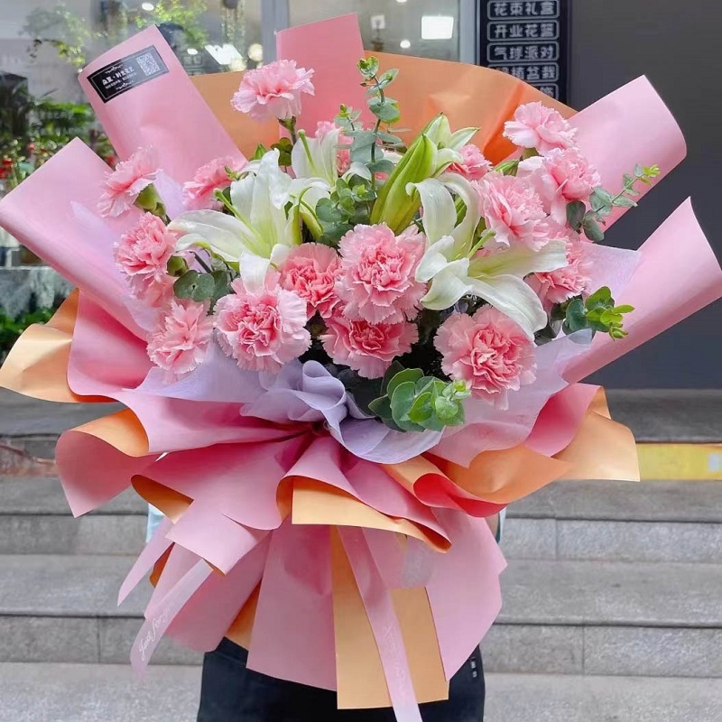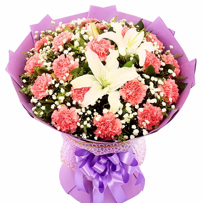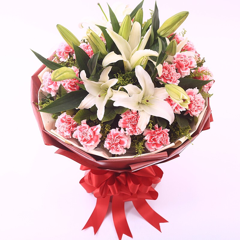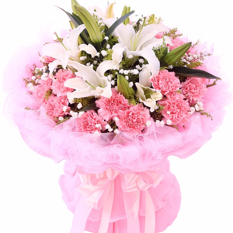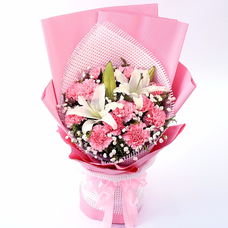 【祝福与您】19朵粉色康乃馨,6朵香水白百合,搭配满天星、黄莺穿插点缀。