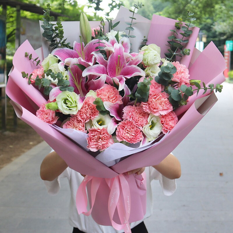【幸福领悟】19朵粉色康乃馨,2支粉色多头百合,搭配4支洋桔梗、尤加利叶装饰。