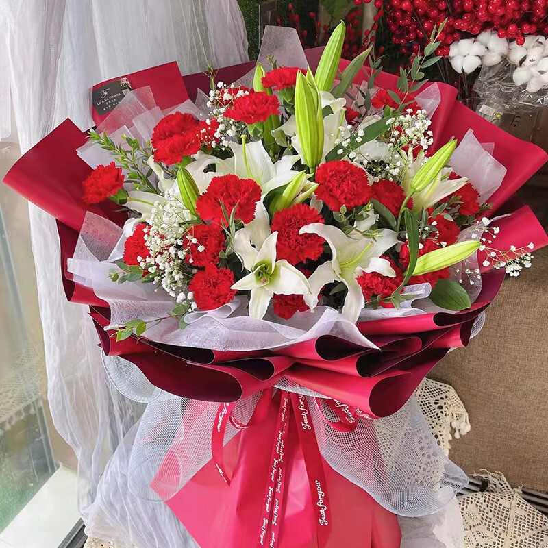 【祝福之花】19支红色康乃馨,2支多头粉百合,搭配尤加利叶、石竹梅等配花。