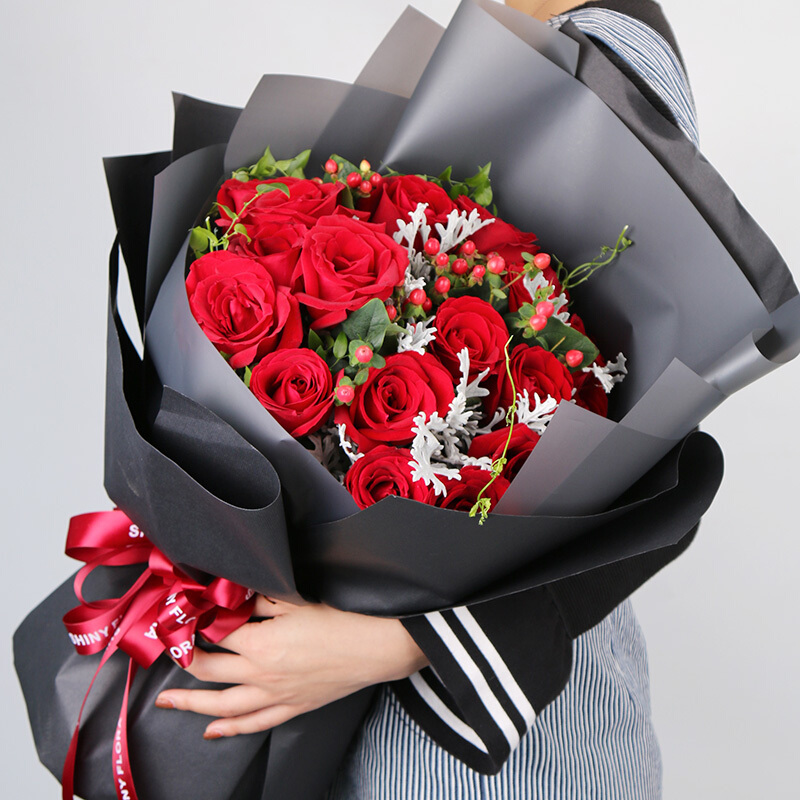 【直到永远】19朵精品红玫瑰,火龙珠、银叶菊、绿叶间插。