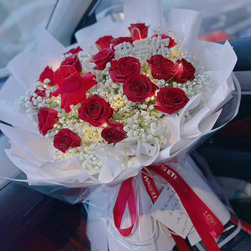 【你是我的璀璨星光】19朵精品红玫瑰,4支多头白色香水百合,搭配满天星装饰。