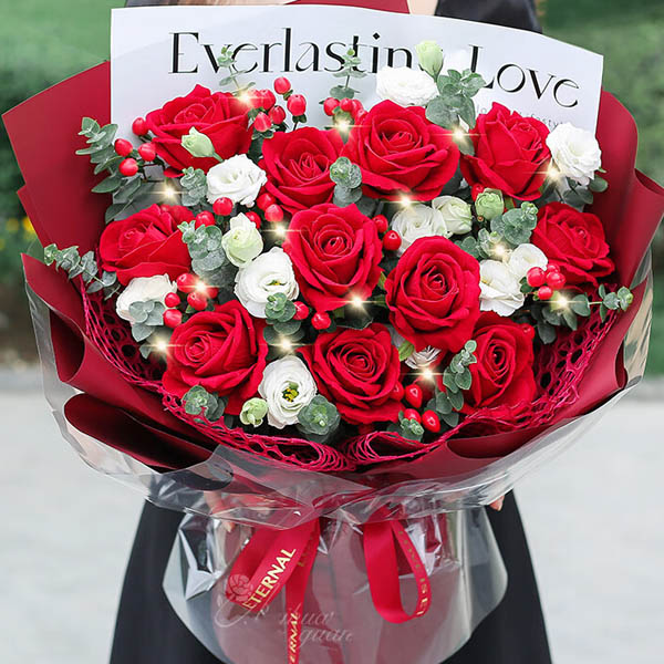【大城小爱】精选11朵红玫瑰,5支洋桔梗,1条灯串,搭配红豆、尤加利叶装饰。