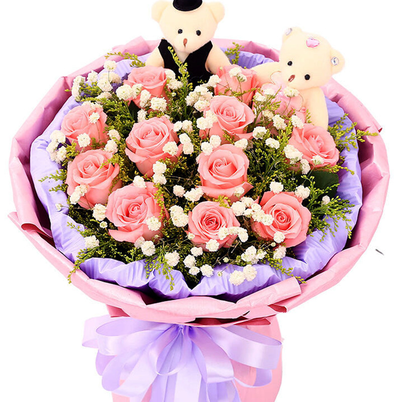【你和我】11支精品粉玫瑰,搭配黄莺、满天星,2只可爱小熊。