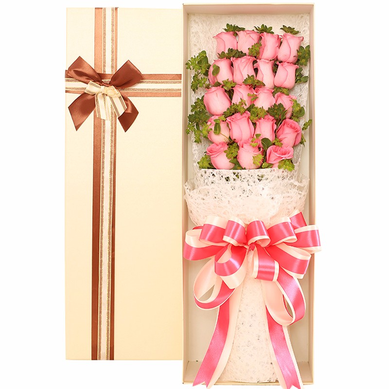 【情窦初开】19枝精品粉玫瑰,搭配叶上金、绿叶。