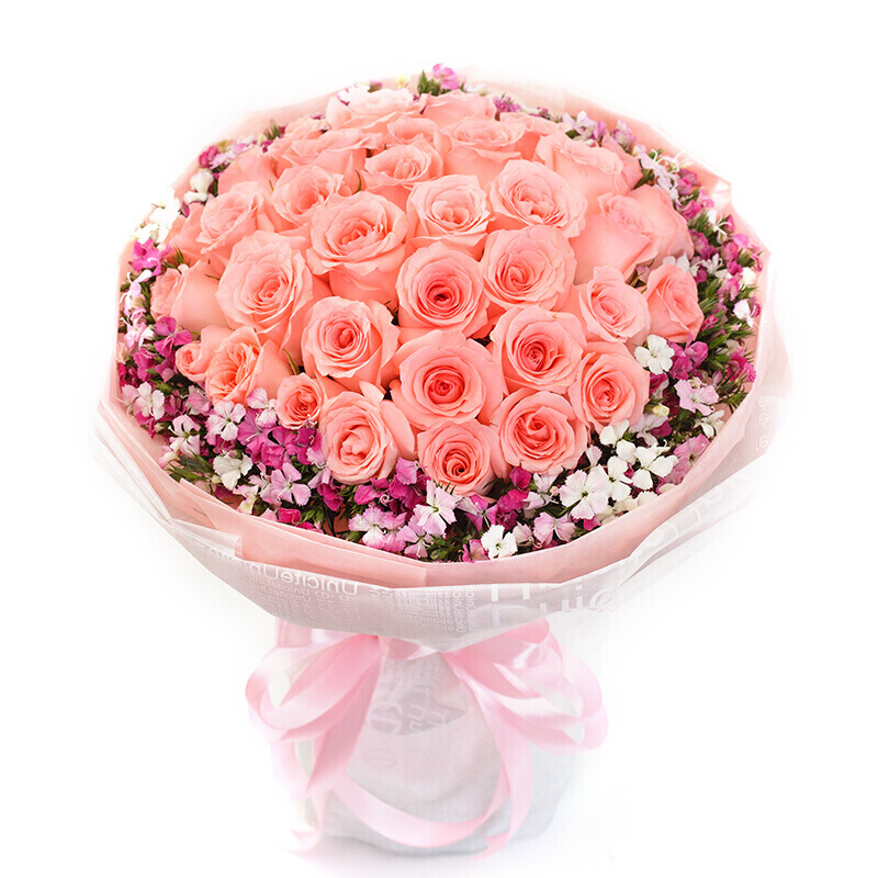 【玫瑰之恋】33朵精品戴安娜粉玫瑰,石竹梅环绕点缀。