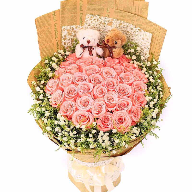 【真爱如初】33朵戴安娜(顶级)玫瑰,2只小熊,满天星围绕点缀。