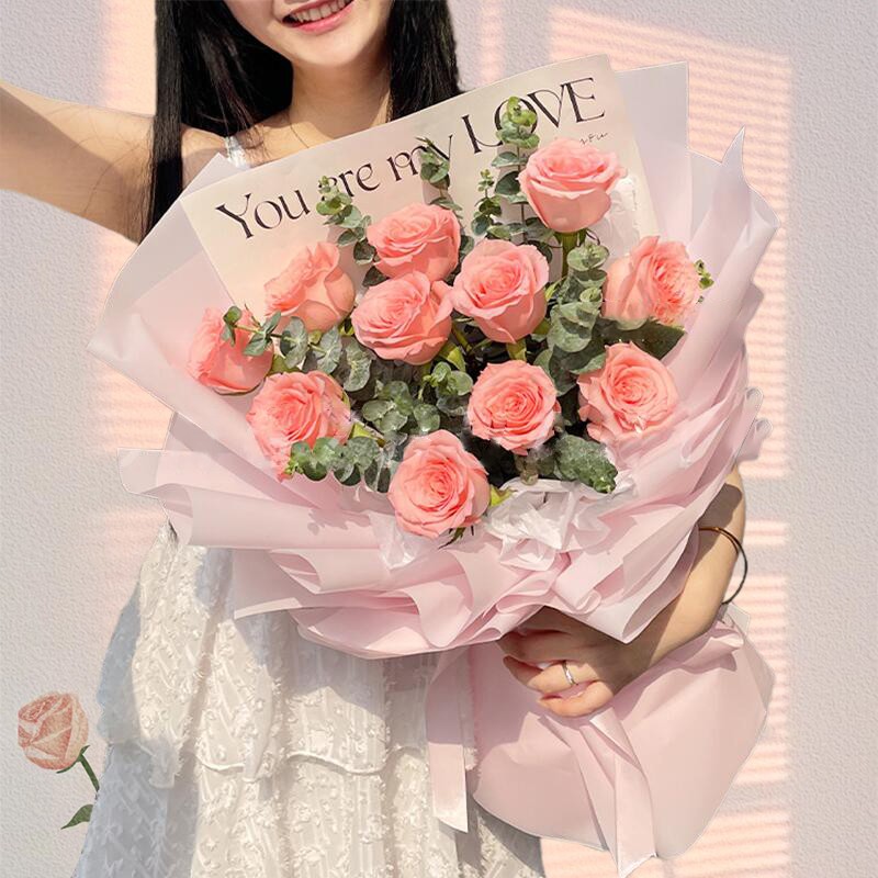 【追寻美好】11枝精品戴安娜粉玫瑰,搭配尤加利叶间插丰满。