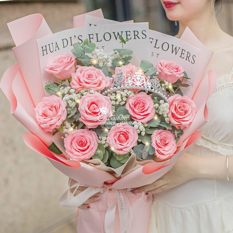 【在水一方】11朵粉玫瑰,1条灯带,1个皇冠(样式随机),搭配满天星尤加利叶装饰。