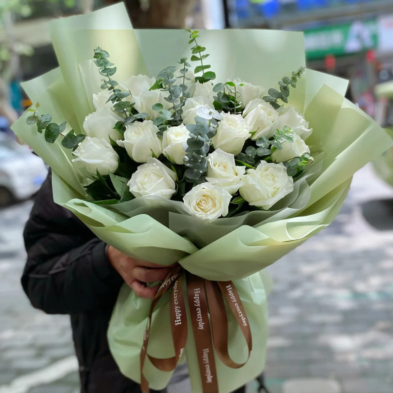 • 【雪中月色】精选11朵白玫瑰,5枝多头洋桔梗,搭配尤加利叶装饰。