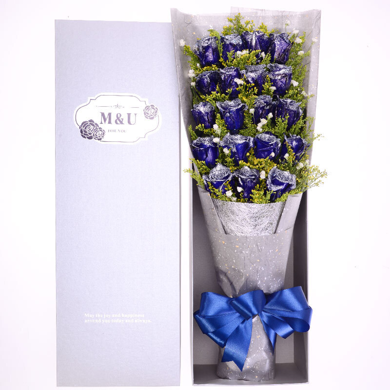 【蓝色传说】99朵精品蓝色妖姬,搭配紫色勿忘我外围点缀(若勿忘我不在花期,可用石竹梅或满天星代替)