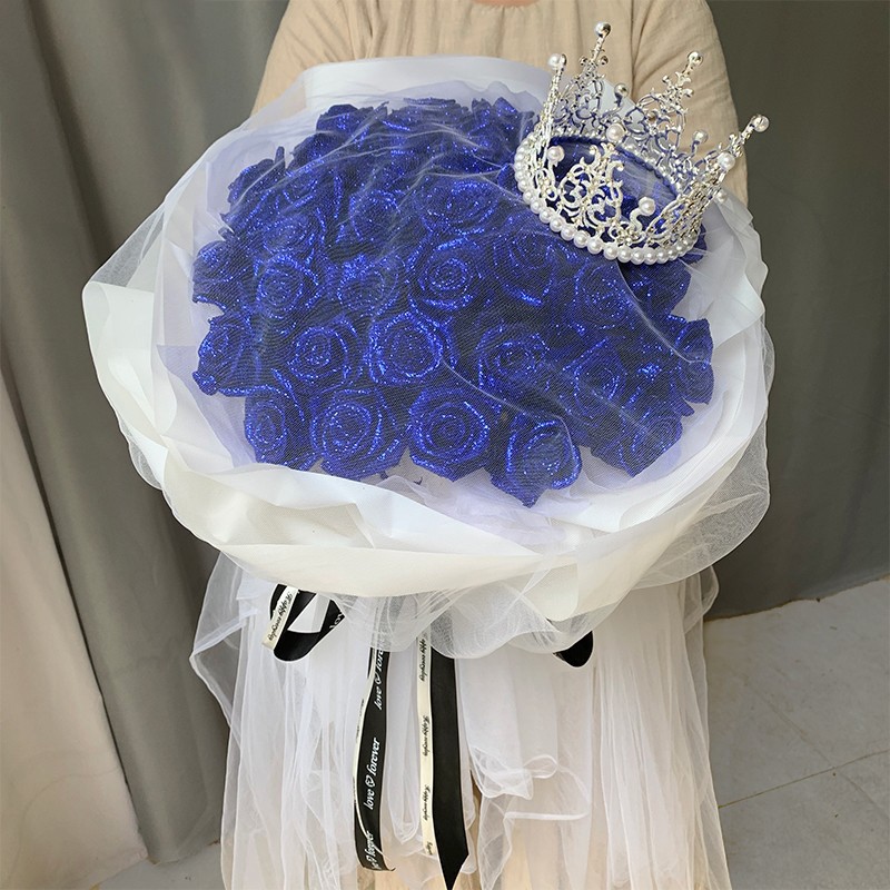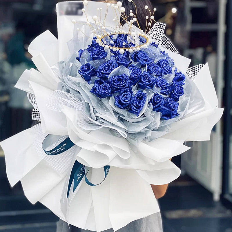 【微笑里的甜】33朵蓝色妖姬,搭配雪梨纸间隔,皇冠装饰。