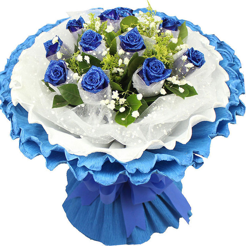 【星光闪闪】11支精品蓝色妖姬,搭配适量白色满天星、黄莺、栀子叶。