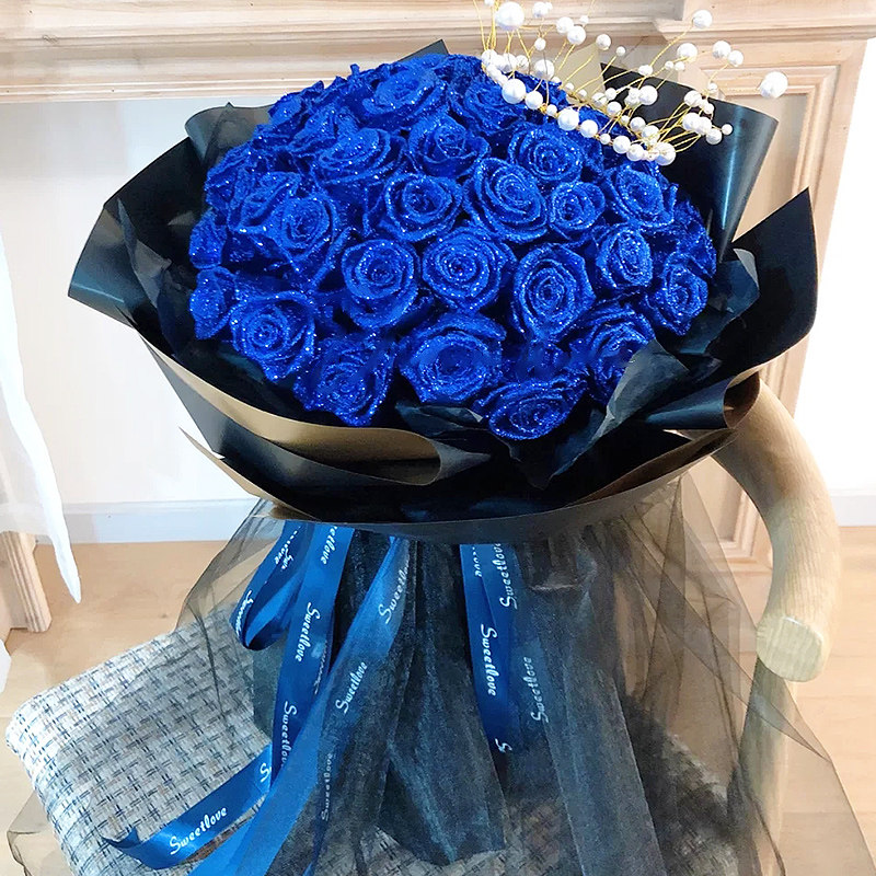 【永远为期】33朵蓝色妖姬,银粉点缀,搭配情人草、满天星装饰。