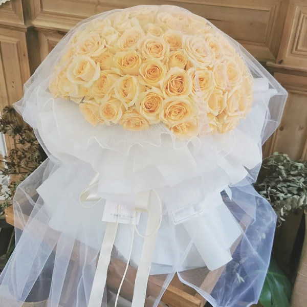 【星火赠你】33支精品香槟玫瑰,外围搭配适量白色满天星、黄莺。