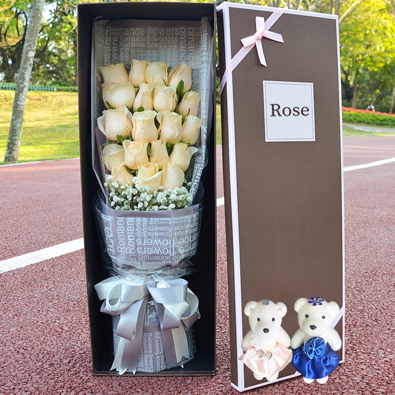 【青春最好时】精选19朵香槟玫瑰,2只可爱公仔,搭配满天星、绿叶装饰。