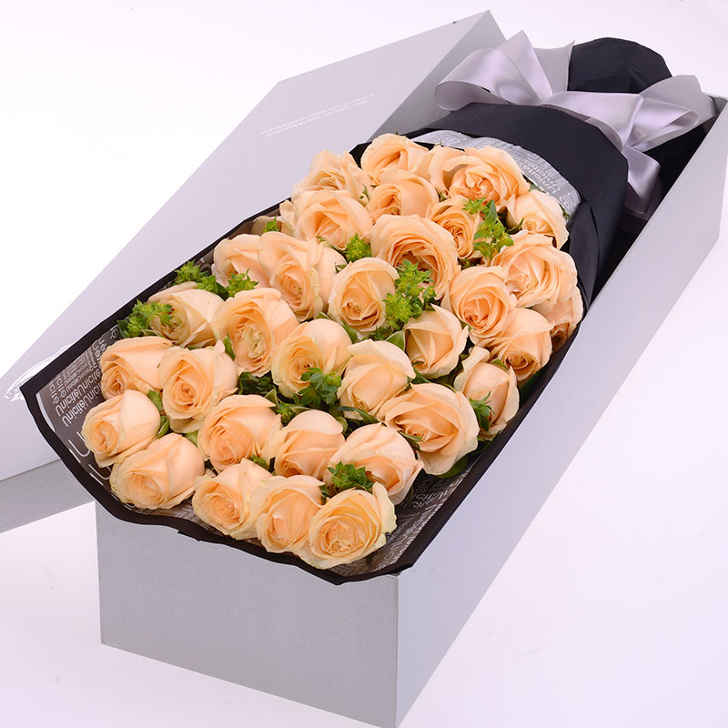 【温柔的爱】33枝香槟玫瑰,黄莺点缀。