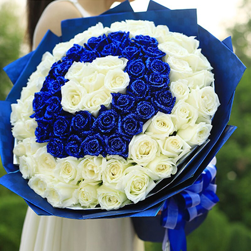 【温柔聆听】99朵混搭玫瑰(里面6朵白玫瑰、33朵蓝色妖姬绕2圈,60朵白玫瑰外围环绕)