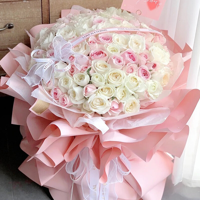 【爱在初夏】精选99朵白色、粉色玫瑰(白玫瑰大概占2/3),1只蕾丝蝴蝶结、1条粉白色缎带装饰花面。