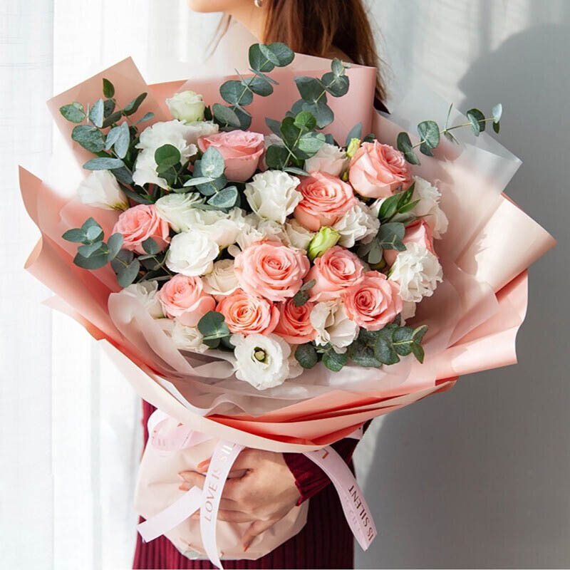 【伸手挽月】19朵混搭玫瑰(11朵粉玫瑰、8朵白玫瑰),洋桔梗、相思梅,尤加利叶装饰。
