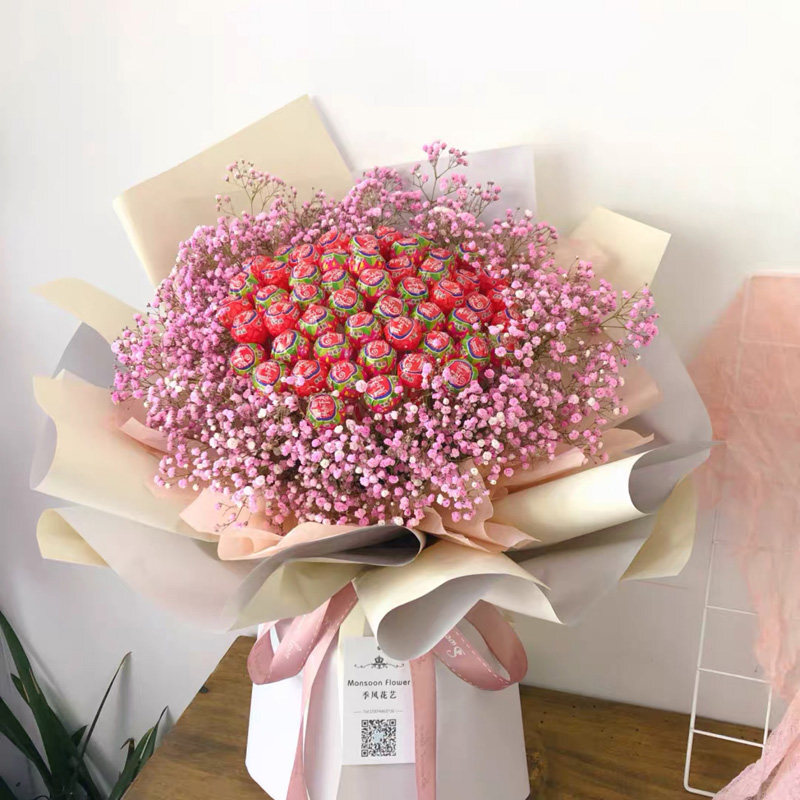 【恋爱泡泡】99颗棒棒糖,搭配粉色满天星外围环绕 。