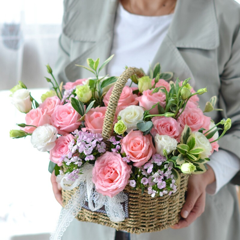 【粉色密语】1支粉色绣球,16朵粉色康乃馨,6朵粉玫瑰,11支白色洋桔梗(断货则用11朵白玫瑰代替),搭配桔梗、多头粉康、尤加利叶等配花装饰。