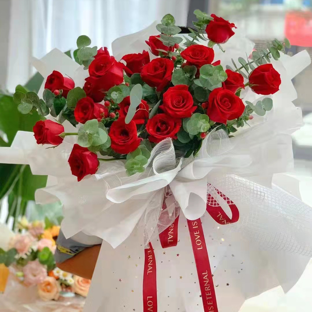 【期待花开】11朵红色玫瑰,搭配6支白色洋桔梗(断货则用6朵白玫瑰代替),搭配尤加利叶、红豆装饰。