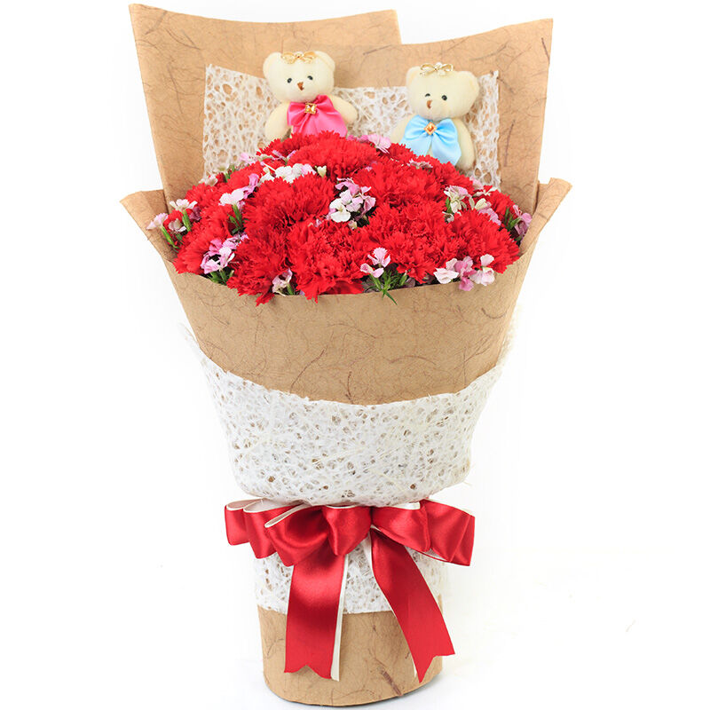 【春辉永绽】19支红色康乃馨,间插石竹梅,搭配2只可爱小熊。