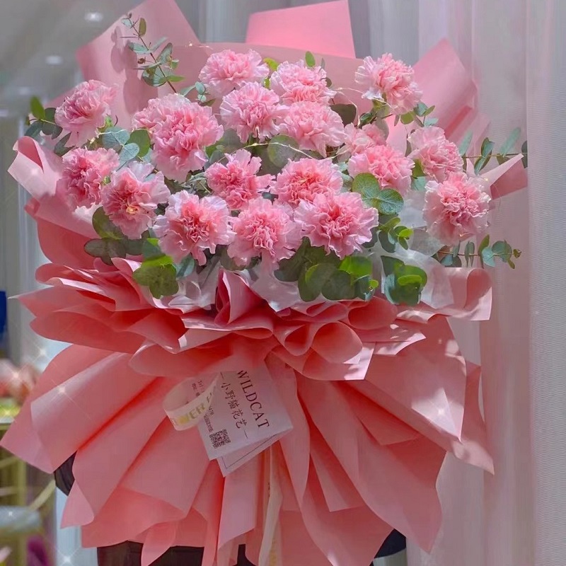 【幸福安康】19朵粉色康乃馨,搭配尤加利叶装饰。