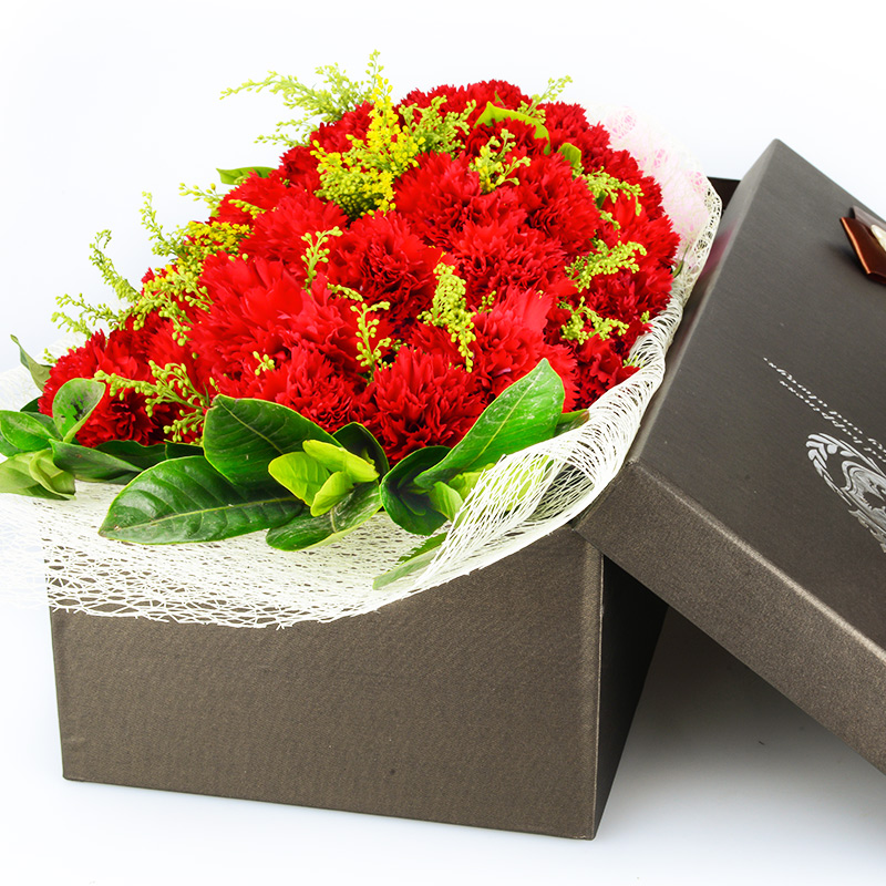 【牵挂】精选33支红色康乃馨,搭配叶上黄金点缀。