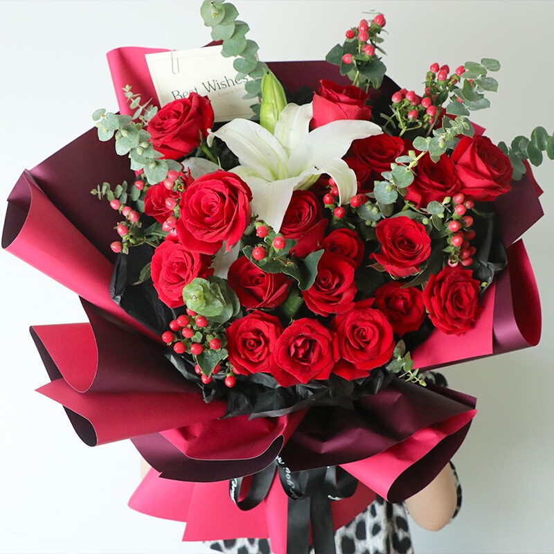 【花开不败】精选11朵红玫瑰,1支多头白色香水百合,搭配尤加利叶、满天星丰满装饰。