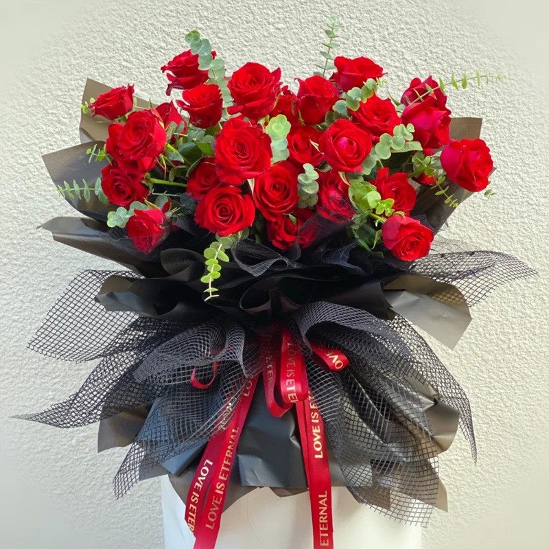 【花梦旅人】33朵红玫瑰,尤加利叶间插装饰。