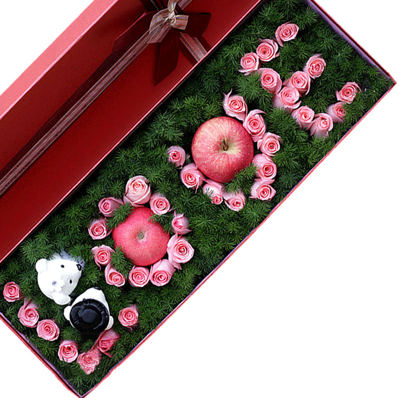【幸福时刻】红苹果2颗、戴安娜粉玫瑰37朵、可爱小熊2只,搭配丰满天冬门装饰。