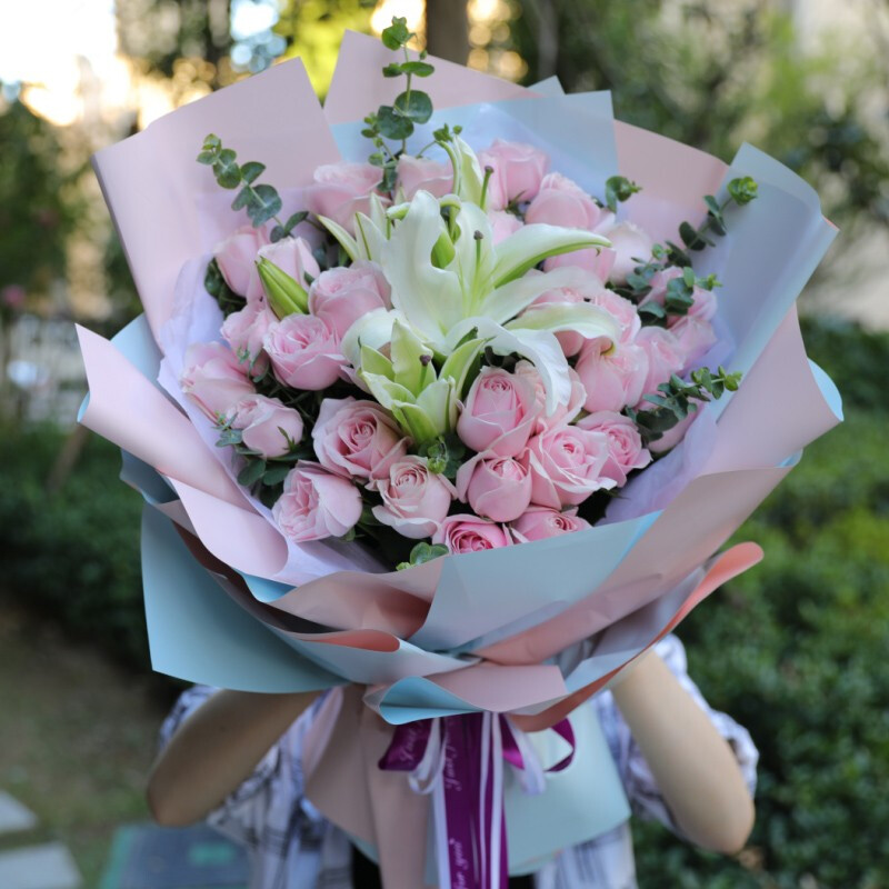 【鸟语花香】精选33支粉玫瑰,2支白色多头香水百合,搭配适量尤加利叶装饰。