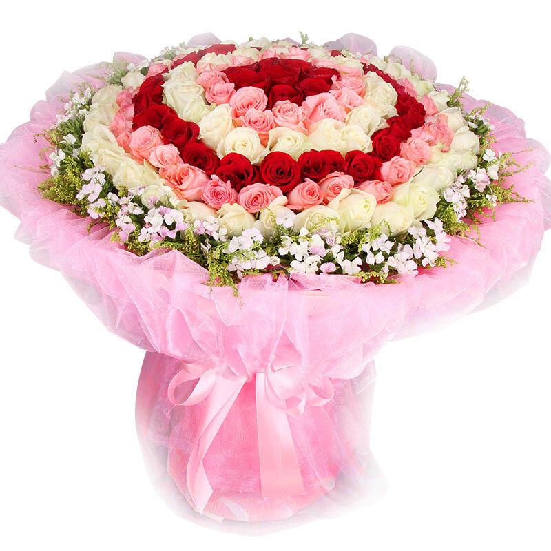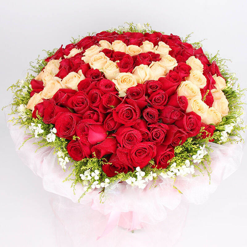 【一生等一人】99朵玫瑰(22朵红、33朵粉、44朵白玫瑰),黄莺环绕。