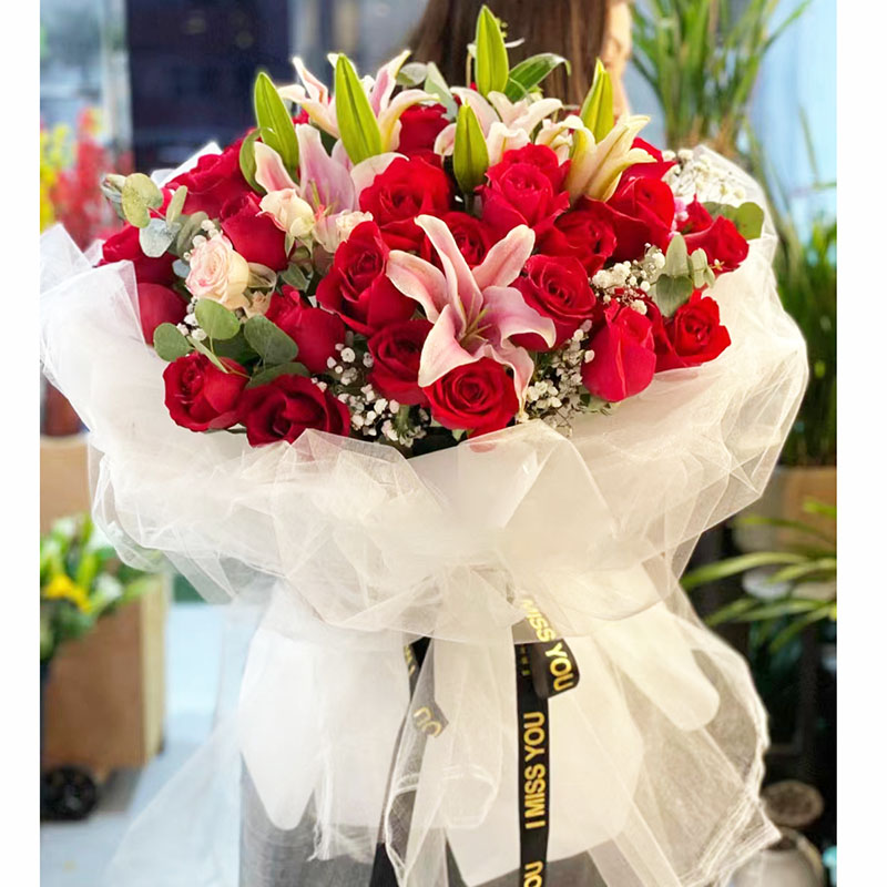 【青春相守】33朵红玫瑰,4支多头粉色香水百合,搭配尤加利叶、满天星装饰。