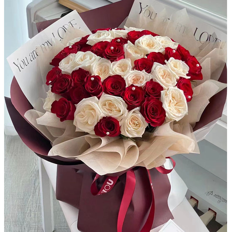 • 【只要你在】52朵红玫瑰白荔枝玫瑰混搭(30朵红玫瑰,22朵白荔枝玫瑰),搭配小珍珠装饰花面。
