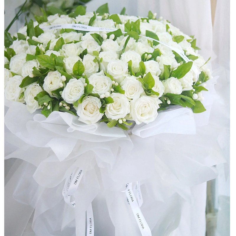• 【念念不忘】99朵白玫瑰松散包装,茉莉花丰满间插装饰(若茉莉花不当季断货,则用尤加利叶、栀子叶搭配白色满天星或者洋桔梗装饰)