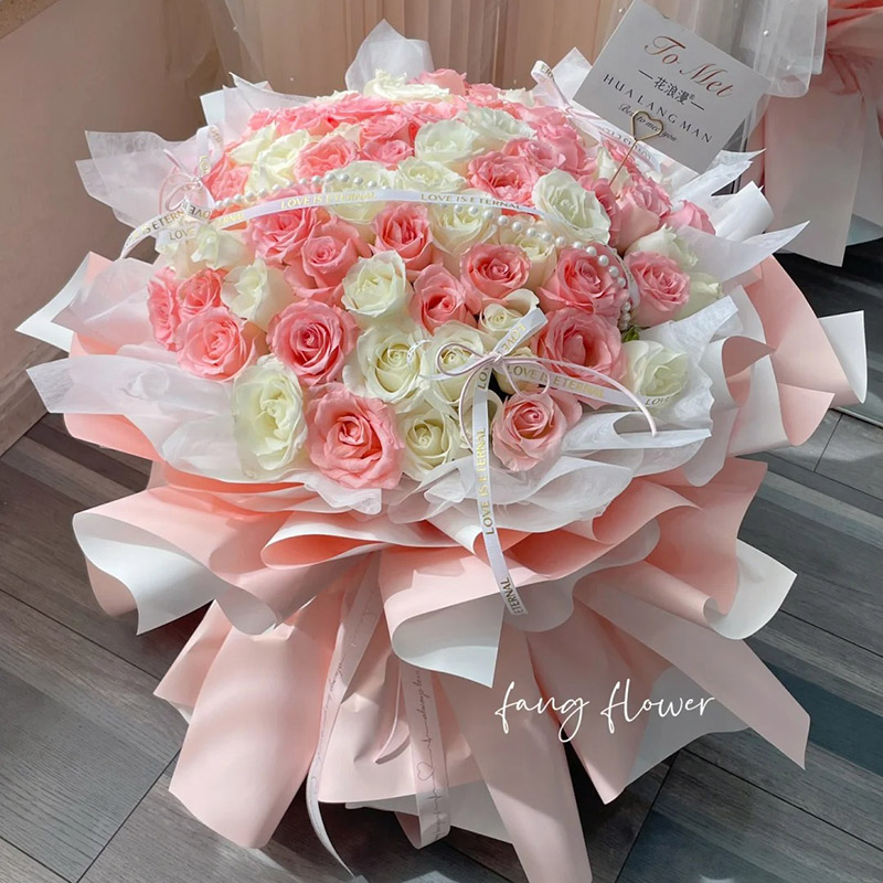 • 【甜蜜派送】99朵玫瑰混搭(白玫瑰、粉玫瑰占一半),1条珠串,3只蝴蝶结、1条白色缎带装饰花面。