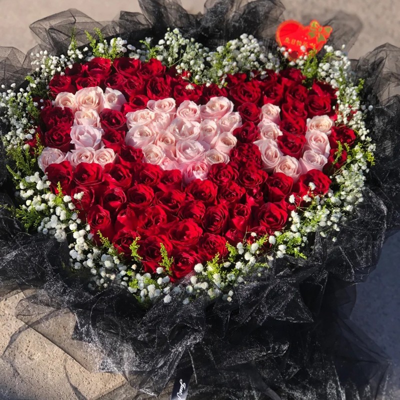 【一生爱你】99朵玫瑰心形造型,粉玫瑰拼成“I ❤ U”形状,红玫瑰围边,满天星、黄莺草环绕装饰。