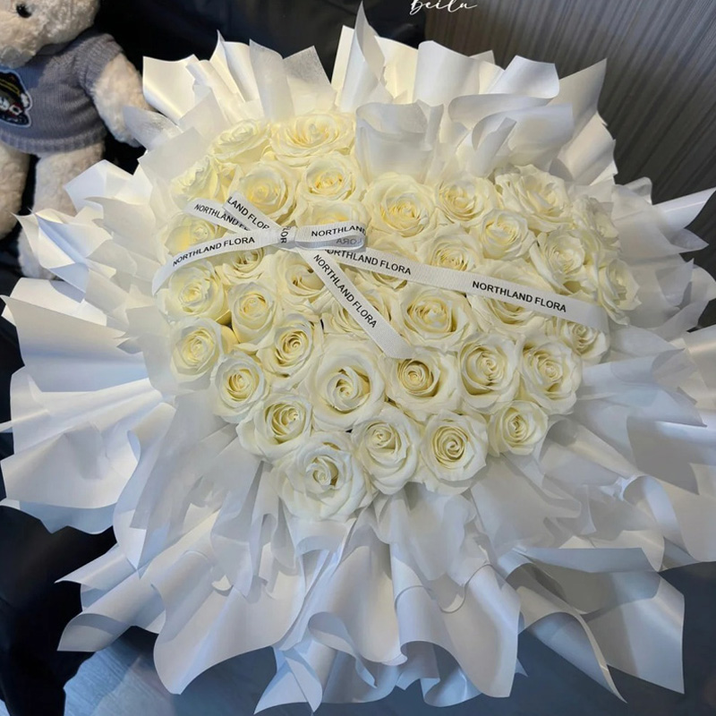 【白头偕老】精选36朵白玫瑰,心形造型,白色缎带系蝴蝶结装饰花面。