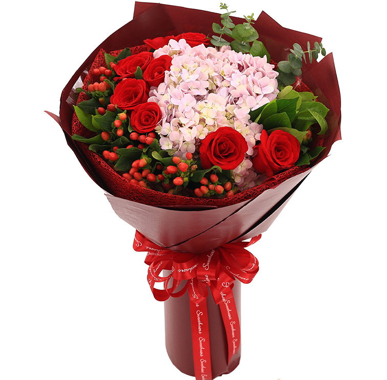 • 【爱无悔】9朵红玫瑰,2只绣球花,搭配红豆、尤加利叶、栀子叶。
