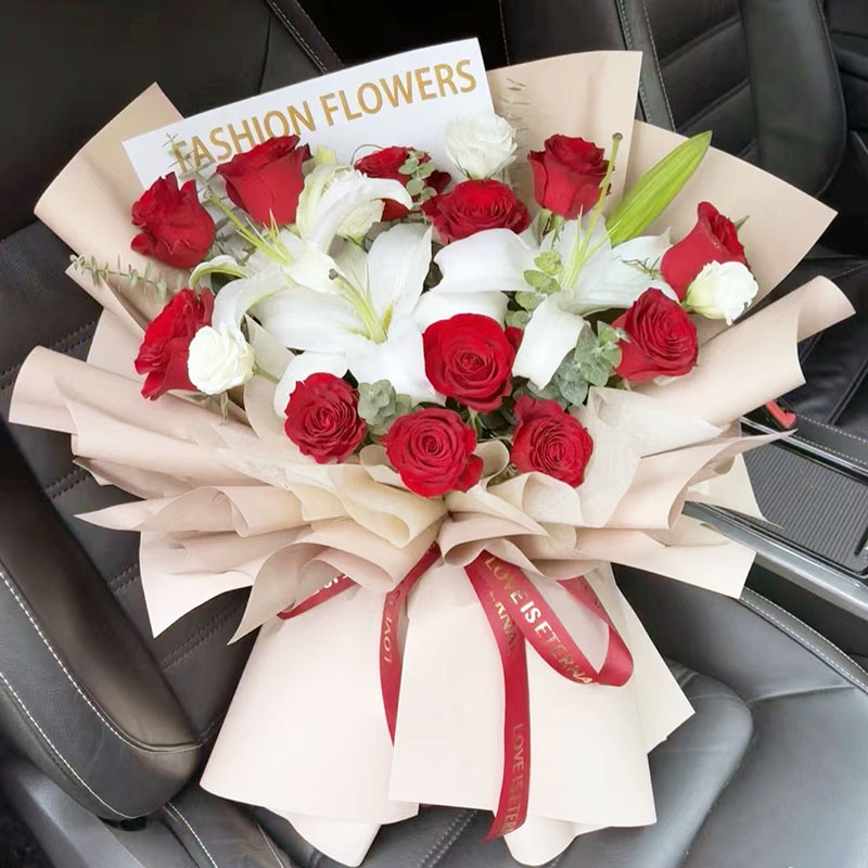【花开不败】精选11朵红玫瑰,1支多头白色香水百合,搭配尤加利叶、满天星丰满装饰。