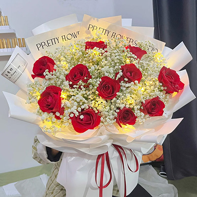【胭脂雪】11枝红玫瑰,1条灯串,搭配白色满天星丰满间插。