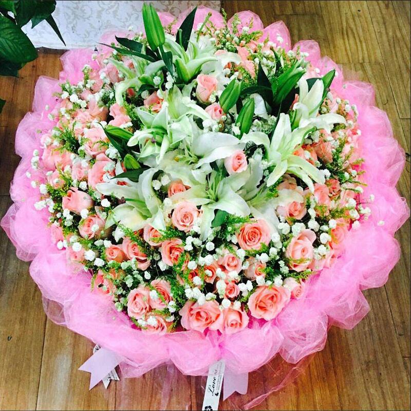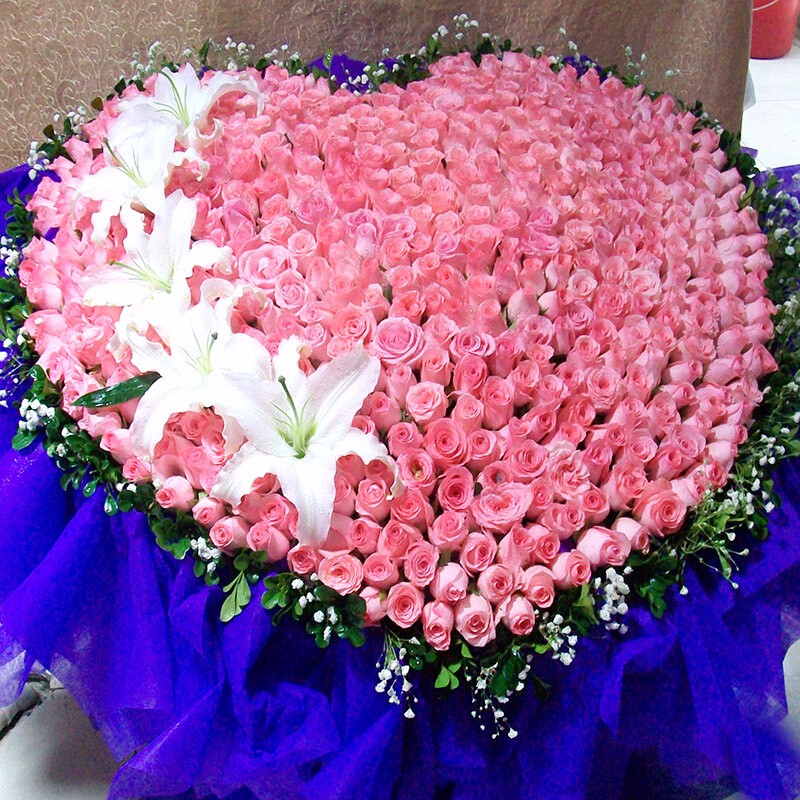 【真挚的爱】999支顶级玫瑰(933支云南顶级红玫瑰,66支粉玫瑰),19支多头香水百合,黄莺间插搭配。