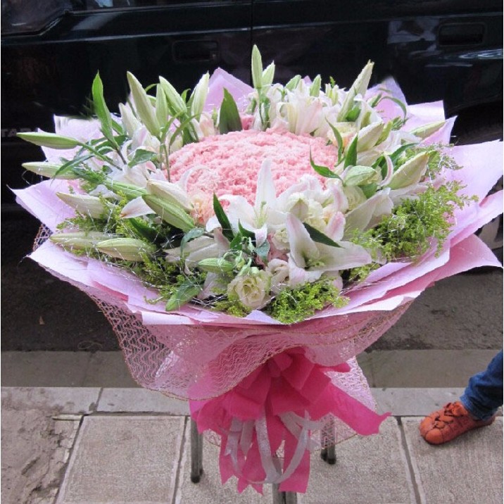 【大爱无声】精选99支粉色康乃馨,21支多头香水百合环绕,黄莺、银丝外围点缀。