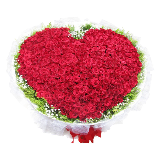 【全身心爱你】999朵精品红玫瑰,心形造型,外围进口羽毛装饰。