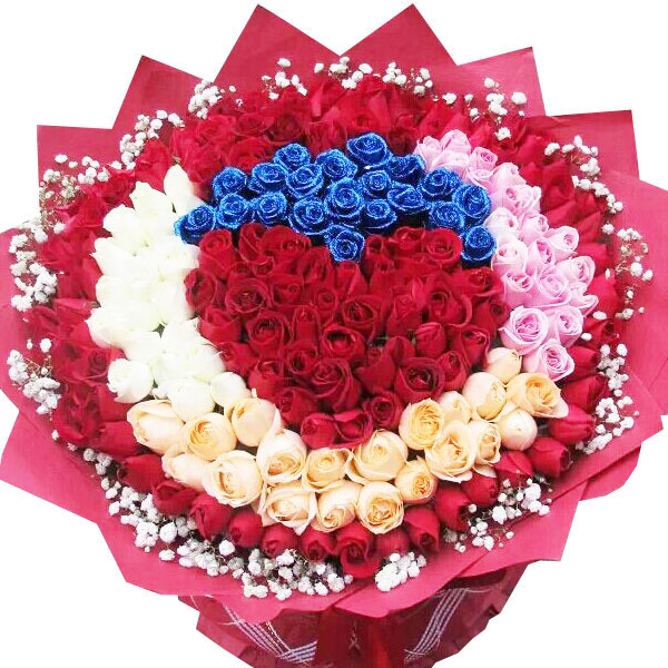 【浓情蜜蜜】156朵极品蓝色妖姬、红玫瑰、白玫瑰、香槟玫瑰、粉玫瑰合成,四周满天星点缀。