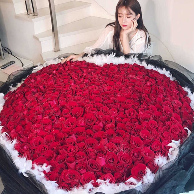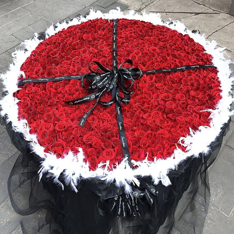 【情书】精选999朵红玫瑰,外围进口白色羽毛装饰,黑色英文缎带十字礼物花结。