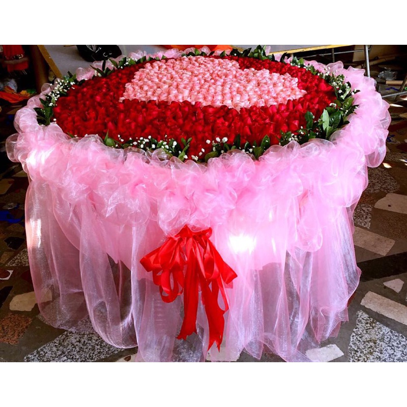 【你是我的生生世世】999支混色玫瑰(红玫瑰+粉玫瑰),粉玫瑰心形造型,搭配适量白色满天星、绿叶。