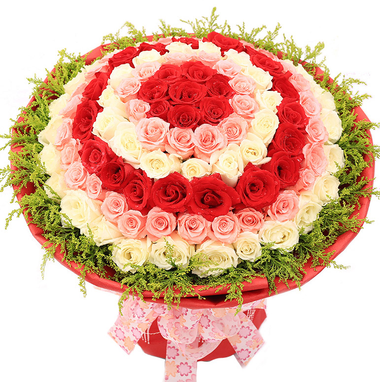 • 【一生等一人】99朵玫瑰(22朵红、33朵粉、44朵白玫瑰),黄莺环绕。